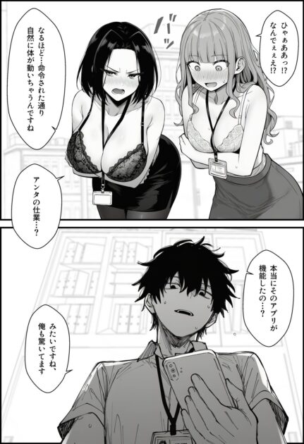仕事を押し付けてくるパワハラ女社員の同期と先輩に、主人公が催眠アプリで反撃を開始。二人を意のままに操り、羞恥的な命令を次々と実行させていきます。